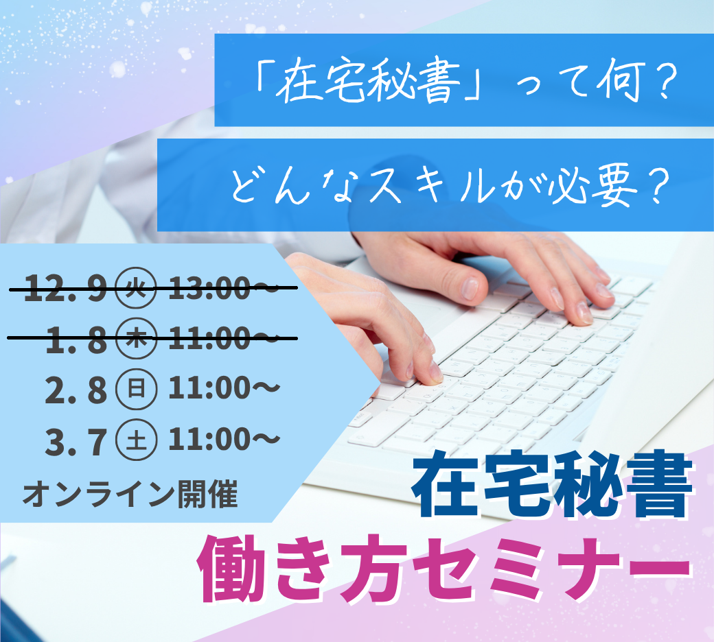 弊社では、「在宅秘書」について理解し、一歩を踏み出していただくべく、無料のオンラインイベントを開催しています。 在宅秘書 働き方セミナ...